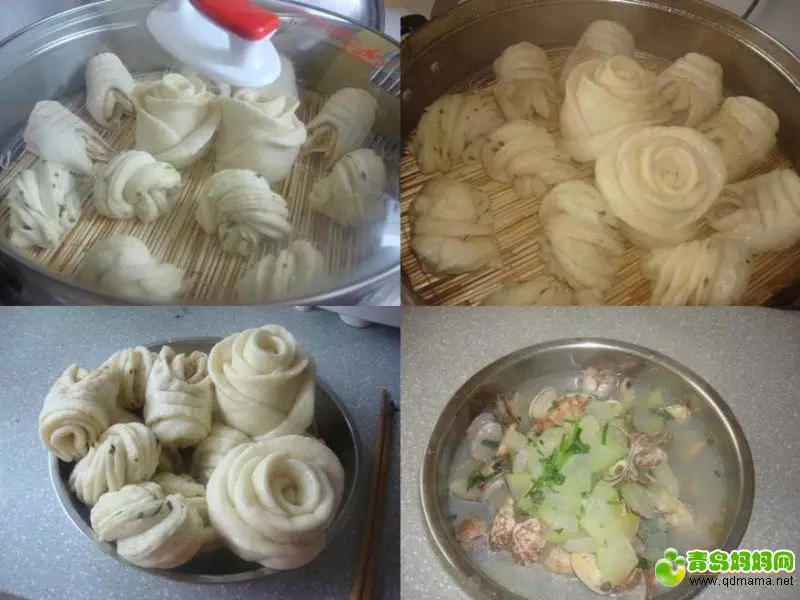 1、玫瑰花馒头:(有时在几个面皮间抹点油,加点盐,花椒面什么的,像花卷的味道,也好分层)