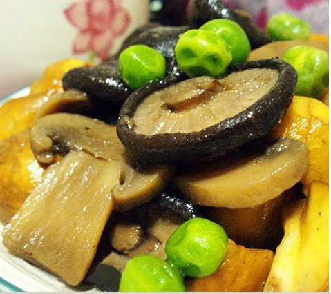 杏鲍菇1个(约100克)、香菇50克、白灵菇100克、豌豆150克、生抽30ml、素蚝油15ml、色拉油30ml、蒜末3克、黑胡椒粉2克、盐1.2克