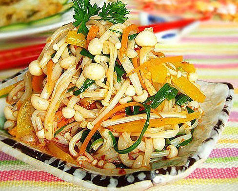 1、茶树菇剪去根蒂洗净切成两段,放入开水烫熟捞出、控干水份放入油中略炸一下