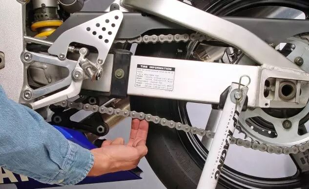 链条是摩托车重要的动力传导装置,如果链条太松,会降低发动机的动力传导效率。太紧又会加剧链条及链轮的磨损,甚至有可能导致后轮的突然锁死,正确调整好链条松紧很重要,一般在链盒部位都有标注上下活动区间,请注意观察。