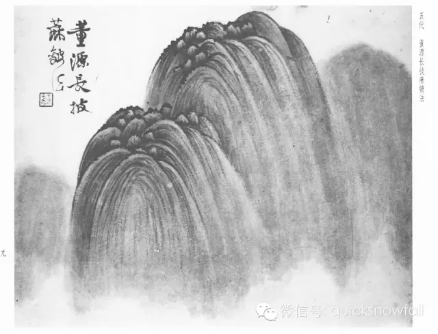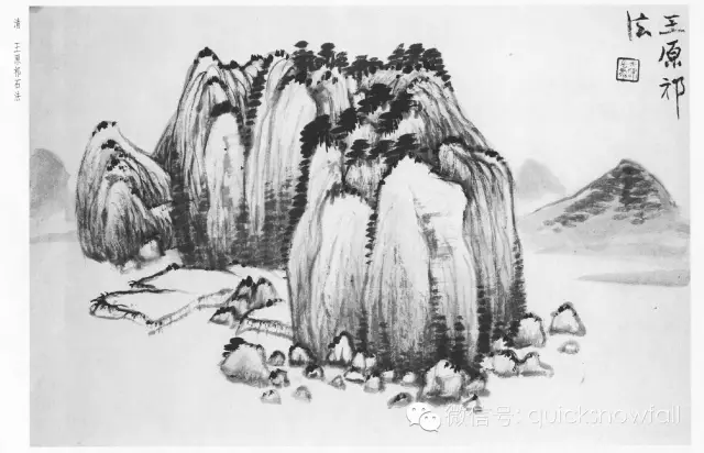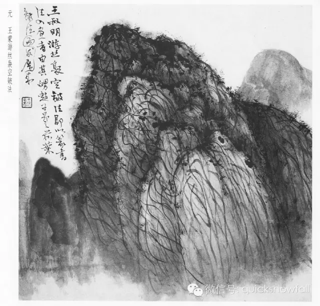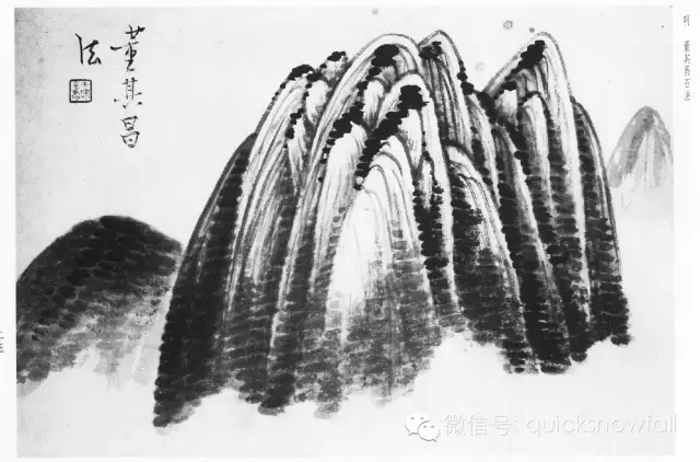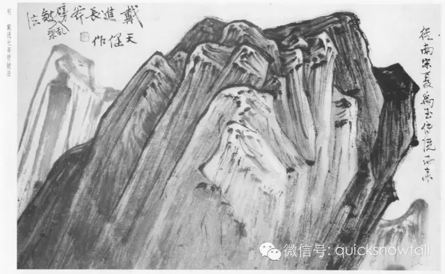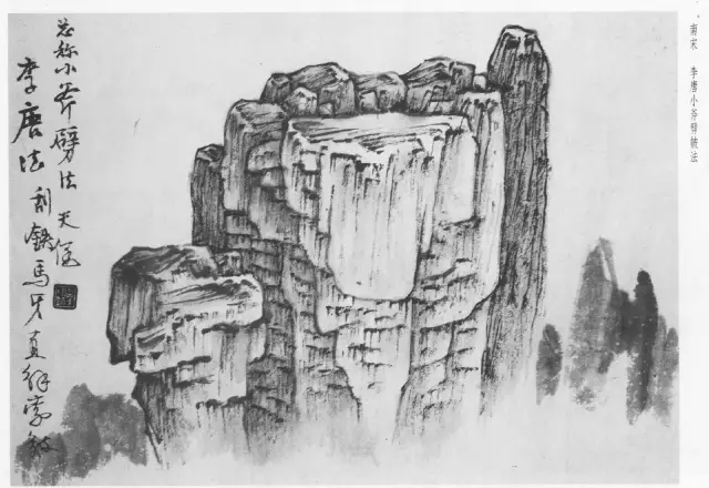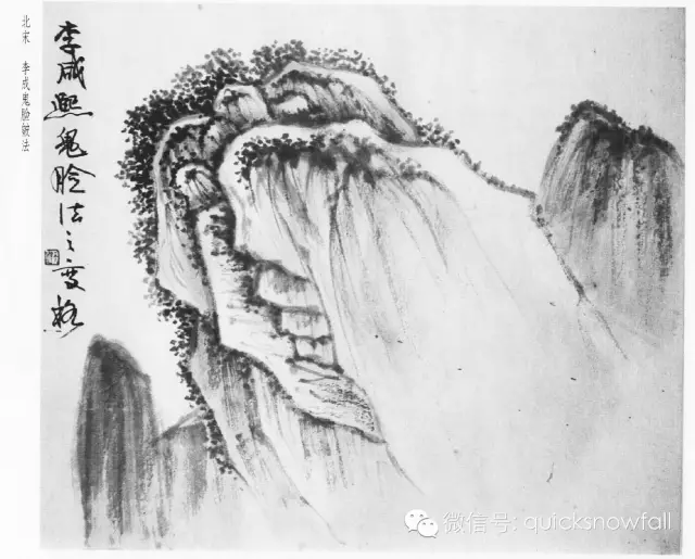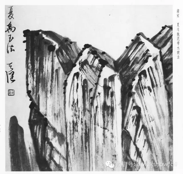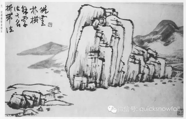 以卧笔中锋勾山石框廊,在阴面斫钉头。 先勾山石框廊,在脉络凹处勾斫钉头皴,再用淡墨水破凹处,反复几次使其有立体感。以淡墨画远山最后加苔点。 先勾山石框廊,在脉络凹处加直解索、鬼脸皴,再用淡墨水破凹处,画远山,最后加树加点。 先勾山石框廊,在脉络凹处略加横索、豆瓣皴。在脉络凹处破淡墨水,渲染出阴阳凸凹面。渲染立体感后再加皴,皴好后再用淡墨水渲染,等干后再重新加皴,框廊脉络要勾出来,可以改变或去掉原来不完美的框廊,最后点苔。 先勾山石框廊,在脉络凹处加豆瓣、雨点、钉头皴,用淡墨水破凹处,后加山顶丛点,再画远山。 北宋 李成鬼脸皴法 用秃笔淡墨勾山框,加鬼脸皴,顺逆上下均用卧笔侧锋,行笔呈弧形,略皴好后用淡墨水破,再画远山。干后再加第二次破,淡墨水比第一次略浓一些,加第三次破时用再浓一点的淡墨破,在凹处形成立体感,等干后加再皴,最后加苔点。总之,李成是自古以来“惜墨如金”的用墨大家,画时心中要有些概念。 先勾山石框廊,略加披麻皴,落笔时干点、毛点,再用淡墨水破,在半干半湿里用淡墨水反复破(全部渲染)。干后用淡墨水破,墨不宜太浓,多渲染几次使画面湿淋淋,要渲染得无笔迹又见笔迹,渲染又忌过生,每次轻轻加染,逐渐深厚丰润而不留笔痕。再画远山。 先勾山石框廊,山顶加矾头,墨色浓一点,勾好后加皴。笔要尖一点的,下笔时上尖下肥,醮一笔一气画成,自然有枯有湿。皴好后用淡墨水破,先后破几次,破出阴阳面,再画远山。再用深一点的墨加皴,要注意皴得松紧调和,皴好后,再用淡墨水破。于后再加皴,山顶矾头用枯笔加,墨要用枯而浓一点的,不能乱加,最后攒点。 先勾山石框廊。加皴,用秃笔卧勾,有的往下卧笔从底下擦上,略皴好后用淡墨水破几次,连续加之,使道生立体感。再画远山,等干后全部用较浓的墨重新加皴,注意皴到下面的须空、淡、枯,最后加攒点、泥里拨针点,下边再用中锋直注啄下,笔头要毛、松、枯、黑。 先勾山石框廊,再用淡墨水渲染出凹凸面,等将干时略加稀松的披麻皴,下笔要枯,再以淡墨水渲染。等干后再用浓一点的墨加矾头,加框线,个别地方加披麻皴,用较大一点的笔加横卧点(落茄法),从下边往上加,下笔要橄榄形,要相互勾搭,粗略加后,再用淡墨水渲染。等干后再加中间横点,下笔要有层次,避免草鞋底,最后攒点。 先用直注中锋勾勒山石框廊,勾时要注意勾出山石的前后面,才能体现山石的圆厚。勾好后用卧笔侧锋加马牙、刮铁、钉头皴。注意马牙下笔要齐,刮铁下笔长短不能齐,刮铁皴多用笔自上而下,但同时也有部分自下而上的。用笔互相呼应,上下结合,互相补充。下边用解索皴,以多见层次,皴好后用淡墨水破,多加见效,凹处加时,淡墨稍浓一些。干后,再以淡墨水加凹处,加山石顶,左面,右面,暗部多加几遍。黑色宜淡不宜浓,有时全面加,有时受光面留白不加,有时要在半干半湿时加,死法活用,使得画面深厚有墨韵。 南宋 马远大斧劈皴法 先用淡墨刮带勾画山石框线,后用淡一点墨水皴,受光部位留出来,画远山。等干后用浓一点的墨水加皴,略皴后再以淡墨水破。干后再用浓墨重新勾框加皴,须加在原来的笔迹上(大斧劈皴),最后加苔点。 南宋 夏圭 拖泥带水皴法 用清水在要画的山石位置上局部皴擦,潮润后,用墨水勾皴山石轮廓,不浓不淡,再用墨水加皴,比原来淡一点,用长锋狼毫,下笔用中锋,不能全部皴,要分出面来。这样在原来清水皴擦处,显现出潮润有变化的笔迹,有雨后嶂犹湿之感,干后用较浓一点的墨水个别加,最后点苔。 先用淡墨勾山框,加荷叶皴,下笔直竖中锋,有干有湿,行笔手要活,要见笔。皴好后用淡墨水破凹处,反复破几次,一次比一次墨色深一点。等干后再加皴,下笔要有浓淡,枯湿,皴好后再用淡墨画远山,以淡墨水加下边,最后点苔。 先用秃笔,卧笔中锋勾皴,皴好后用淡墨水破凹处,最后加攒点。 先勾皴山框,略皴后再用淡墨水破凹处,山石下边反复加几次,破好后用较小笔加皴,在湿时加皴叫破网皴,再用淡墨水个别破。画远山,下笔要快,干后再用浓一点的墨加皴,注意不能谈。皴好后全部上淡墨水渲染,干后用浓淡墨加渴点。 元 王蒙 渴点短披麻皴法 先勾山石框廊,加短披麻皴,用笔以直竖中锋,落笔要枯,做好后用淡墨水破几次,在凹处加时,墨色深一点。等干后,再用较浓一点的墨加皴,从上到下,墨色要有浓淡,皴好后加渴点。