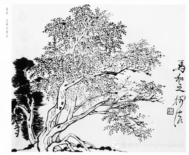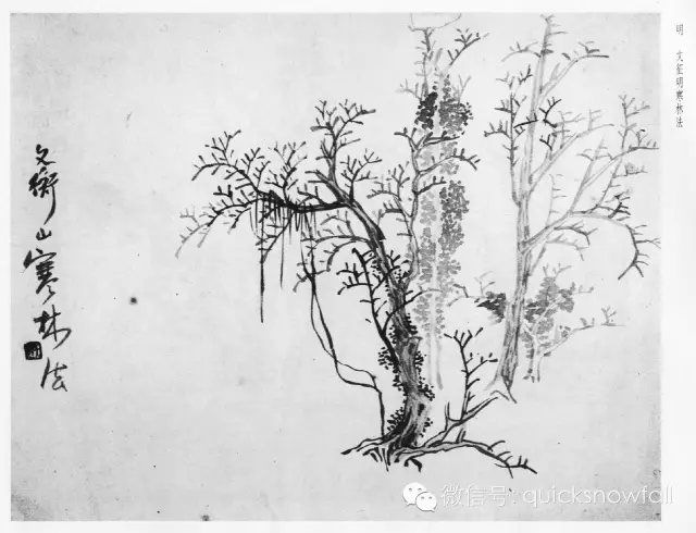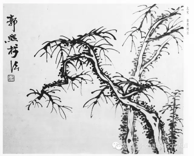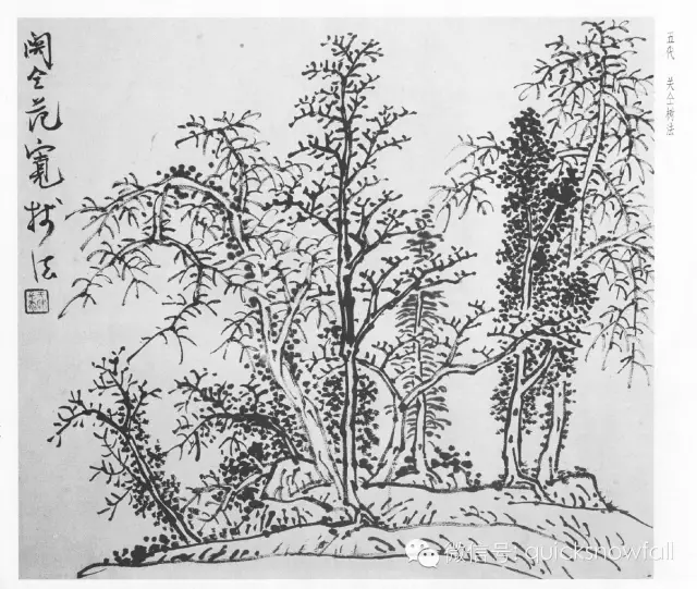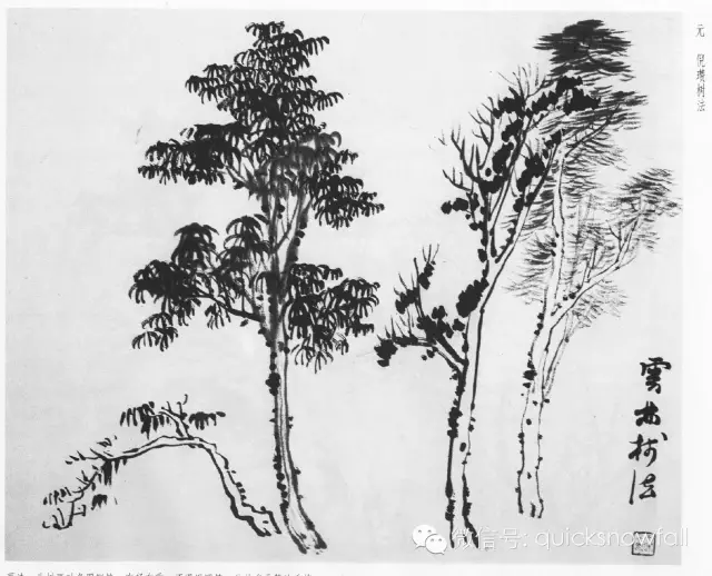 点叶时要注意有疏密、轻重、浓淡干湿。 元 倪瓒树法 此树画时多用侧笔,有轻有重,不得用圆笔,佳处在于笔法秀峭。