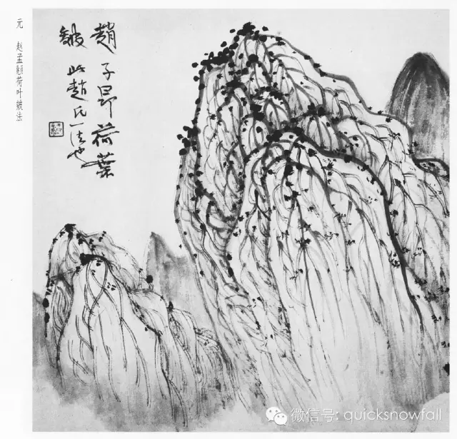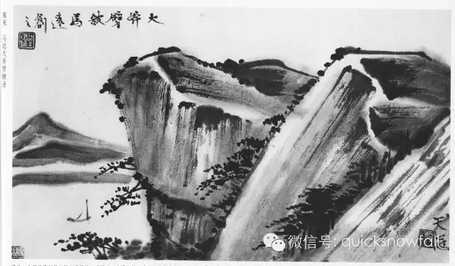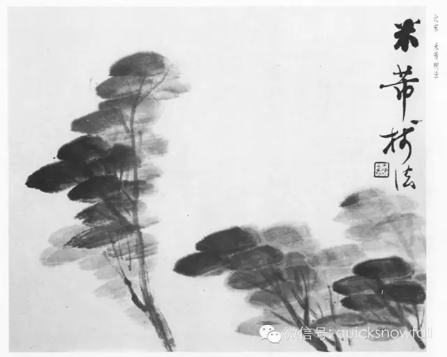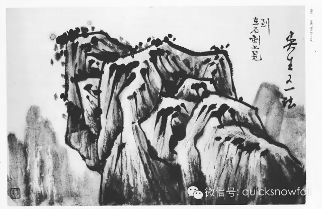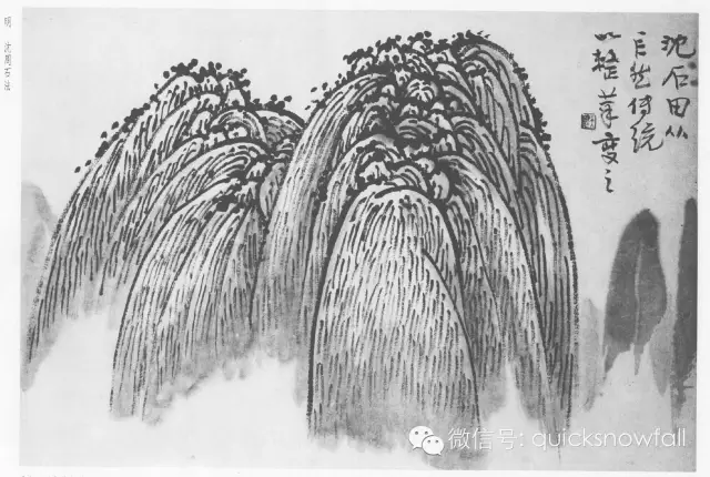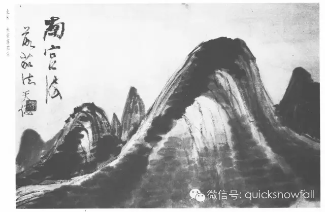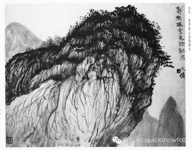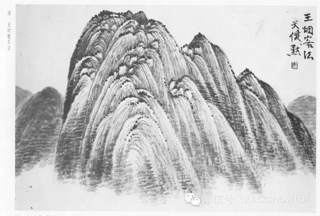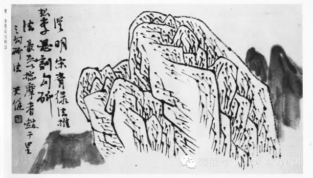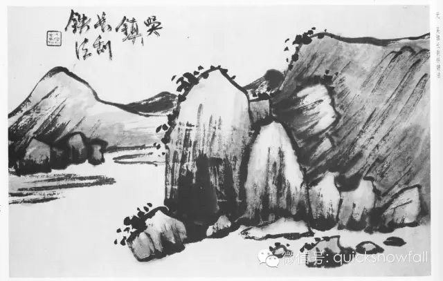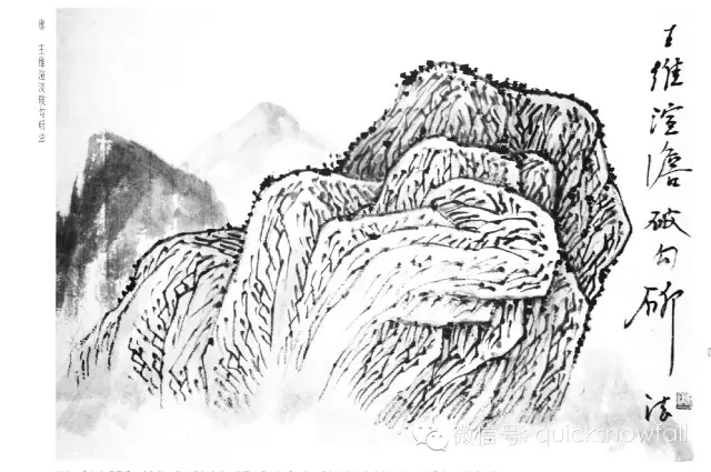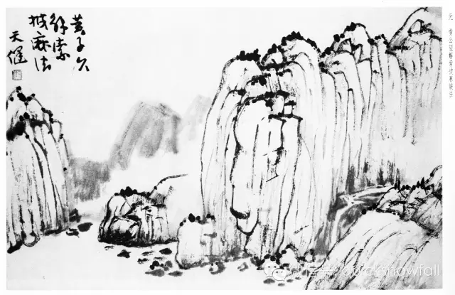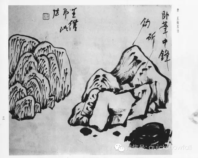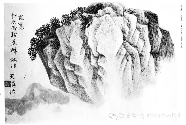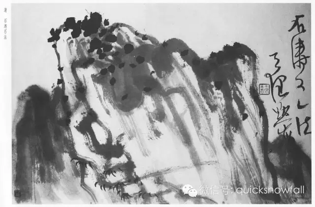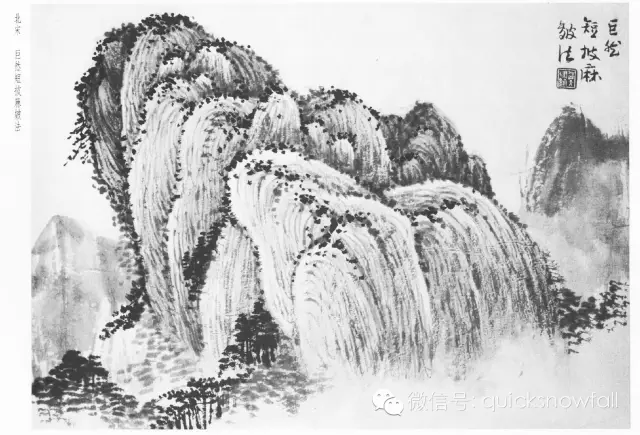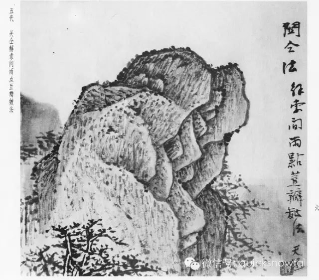 先勾皴,执笔横卧为主,行笔忌光滑,而要毛一些,轻松一些,以显得逸气,勾带皴一气呵成。勾皴好后用淡墨水破,再画远山,干后加横点。 用卧笔中锋勾山框,用长刮铁皴加。落笔从下刮上,皴好后用淡墨水破,反复几次,等干后加梅花大点。 下笔时自前至后,连勾带皴一气完成要笔笔见笔。之后,用淡墨水破之,反复几次,凹处加深一些,等干后用浓墨加皴,落笔要枯、毛。 用卧笔中锋连勾带皴一起画,先画主山,再画远山,用淡墨水破之,反复几次。干后用小笔,浓淡墨相间加皴,拿笔要直竖,行笔要灵活,上浓下淡,皴后再用淡墨水破凹处。 用中锋勾勒山石框廊,加皴注意长短相间,皴好后用淡墨水破凹处,反复加几次,干后个别加皴,最后加苔点。 先勾山框,后略加披麻皴,再用淡墨水破,个别地方反复加。等干 后加浑点,要湿淋淋、淡点,再个别加皴,再用淡墨水破,干后再用浓墨加浑点,笔迹要露出来,最后山顶加横点,先浓点后淡点。 先勾山框,再加披麻皴,用笔要干些,皴好后用淡墨水破脉络凹处,反复加几次,画远山。等干后加皴,加横浑点,再用淡墨水破,干后加皴,用笔要枯、毛、松,皴好后加横点,加时要有枯有湿,最后点苔。 先勾山框,后略加披麻皴,略皴好后用淡墨水破凹处,反复加几次,用淡墨水画远山,干后再用深一点的墨加皴,加横浑点,加山顶小树,加远山,用见笔,有浓淡,有韵,再用淡墨水破。干后再用浓墨加山框,加皴,个加加,用笔要枯,山顶再加浓点,小树周围加淡点,树点好后,再加横浑点,最后加苔点。 先勾山框,勾好后略加皴,再用淡墨水破凹处,多加几次,后画远山。干后再加皴,注意浓淡干湿,最后用浓墨加横点,加山顶小树。 先勾山框,加披麻皴,再在山下边、山顶加点,用淡墨水破阴面,后加苔点,注意用墨要有秀气。 清 石涛石法 下笔须有力,连勾带皴,浓淡干湿一气呵成。再在凹处破淡墨炎,画远山,干后加浓点。 五代 关仝范宽树法 画这种树时,防胖笔,无骨力,树叶点子注意聚散。 先用淡墨勾枝干,注意树枝长短相间、疏密有致,再用淡墨水“破”,第二次用浓一点的墨水“破”出阴阳面。干后再用浓墨加,用笔要有意中无意,有变化,防止太重太繁。 画蟹瓜落笔注意不能直陇,要横散开一点。画树干用笔须有断有续,如似写字,要有自然的节奏,最怕笔僵墨死,光有外形而没神气。 画杂树时,要注意不能雷同,每种树各有它的规律变化。 画树时,最要笔墨淋漓有致,浓淡得宜。