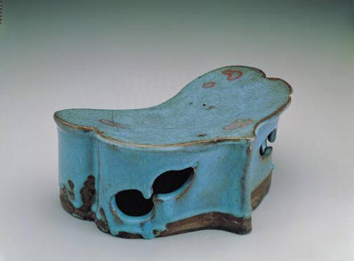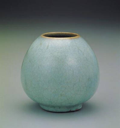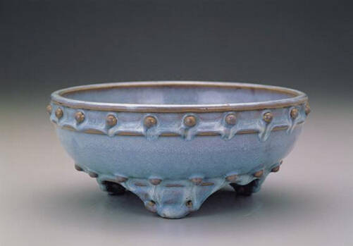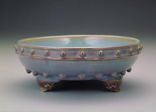 纹理:钧瓷烧造,工艺独特,在色彩斑斓的釉面上,形成千姿百态的纹路,典型的如:冰片纹,看似锤击,抚之无痕;蚯蚓纹,龙走蛇行;鱼子纹,繁星点点。此外还有兔丝纹、蟹爪痕、雨丝纹等。特别具有审美价值的是冰裂纹,俗称“开片”。纵横交错,如网状分布,历来以大器开小片,小器开大片为佳。由于这种纹路是胎质和釉面的冷热收缩率不同而自然形成的。冰裂纹是烧制完成以后开裂造成的,不是在烧制中产生的隐于釉面之中,因此在开片形成的过程中,会产生裂开的声音,一边欣赏着“创过冰河玉凝透,碧莹浅底网捕鱼”的奇妙现象,一边听着轻灵而噼啪悦耳的开片之声,真是一种不可多得的审美意境。