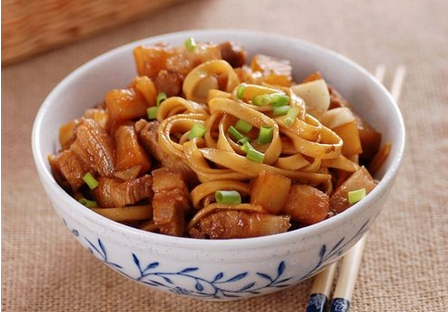 面条 200克、猪肉 100克、生抽 2茶匙、黄酒 1茶匙、蚝油 1茶匙、拌饭酱 1茶匙、葱