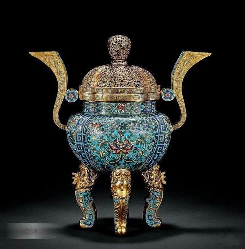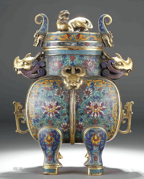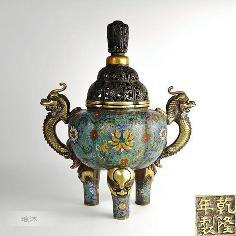铜胎掐丝珐琅缠枝莲三足龙耳薰炉