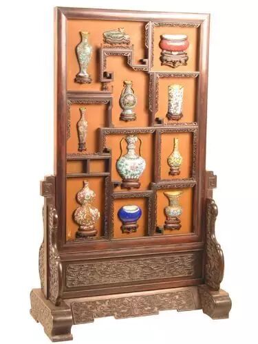 上部屏心巧制成多宝格样式,下部屏架表面浮雕蝙蝠、云朵、钱纹、喜字等图案。屏心一面由木雕制出多个空格,格内分别镶嵌珐琅烧制的各式仿古瓶炉,纹饰逼真而精细,外观新颖而独特,不愧为清宫制作的上佳陈设品。