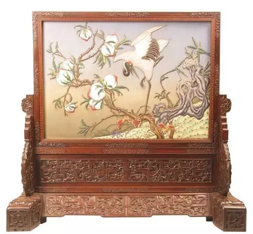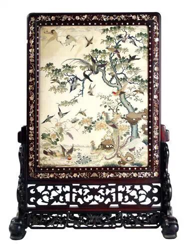 插屏由上下两部分构成,上部为彩绣屏心,下部为木雕底座。全屏框架及底座均由红木制成。屏心边框镶嵌彩色螺钿。