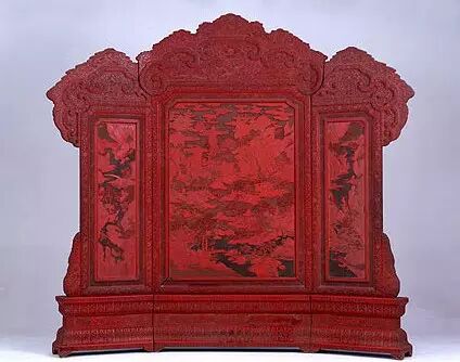 围屏边框均由红剔漆工艺制成,为立式三扇屏。上部为云头形红剔漆屏头,表面满饰云龙纹;中间为开光式黑漆板面,在黑地上竖书白字“御制瑞树歌”。