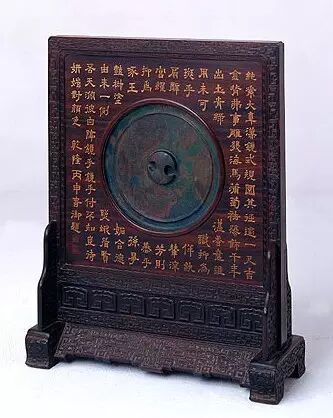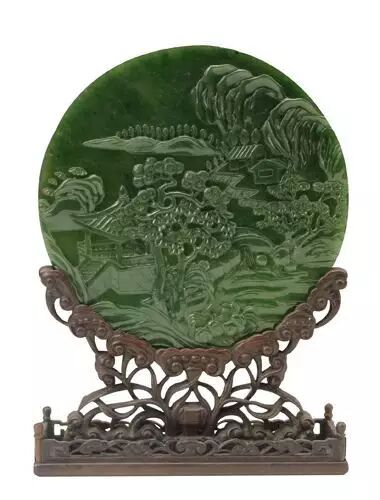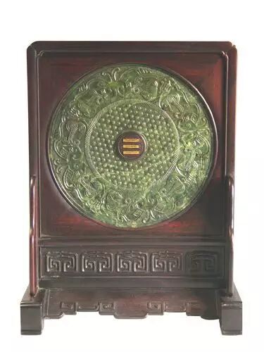 此座屏由红木制成框架及底座,屏心中央镶嵌一块圆形碧玉榖纹璧。屏底座下部浮雕云头纹及回形纹。全屏朴素大方,深沉内敛,充满尚古精神,应是皇帝在宫内御用的文玩用具。