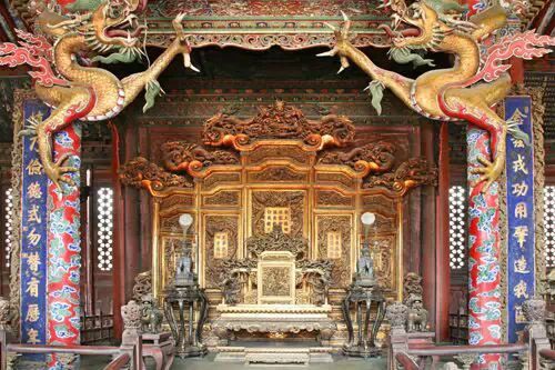 宝座屏风以9扇组合,座、框皆木胎髹黑漆,外加金漆彩绘。