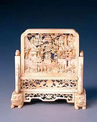 插屏通体象牙质。屏心双面镂雕群仙祝寿图。此屏集微雕、镂雕、浮雕、圆雕等多种雕刻技巧于一身,纹饰繁密,刻工精细,为清乾隆三十八年(1773年)造办处牙雕高手所制。