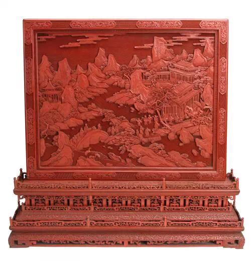此座屏器身通体为剔红工艺制作。屏心与底座之间安有榫卯和螺丝,可拆卸和组装。至于屏风的边框和底座,通常采用红木、紫檀、鸡翅木、花梨木或其他硬杂木制作。