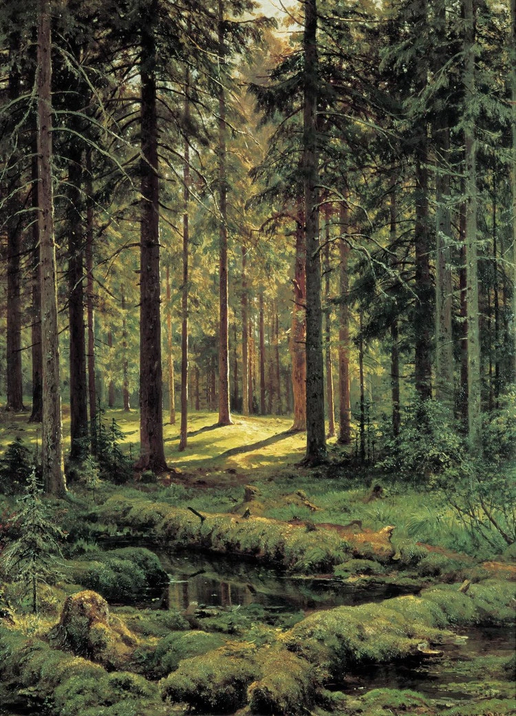 希施金的风景画多以巨大的、充满生命力的树林为描绘对象。 那些摇曳多姿的林木昂然挺立,充满生机。繁木菁林,疏密有致,大森林的美与神秘,被渲染得淋漓尽致,可谓美不胜收。