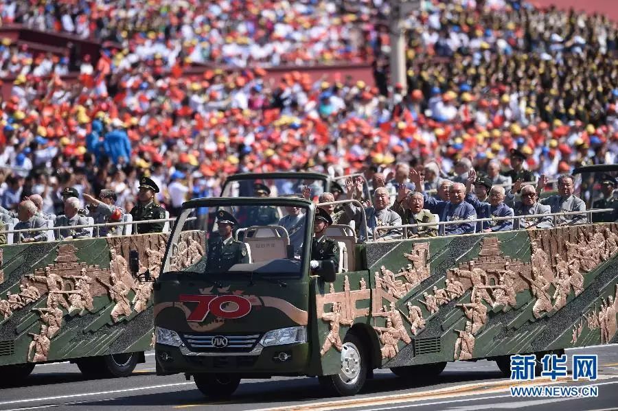 抗战老同志乘车方队:由300余名抗战老兵、英烈子女、抗战支前模范组成的两个乘车方队,行进在受阅方队最前面,接受祖国和人民的致敬。