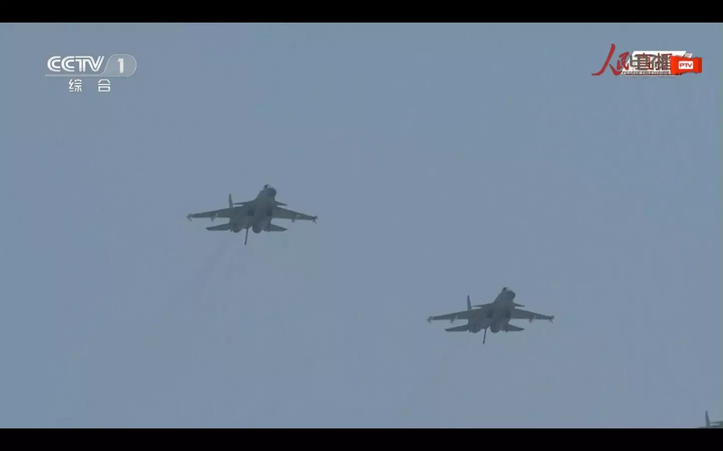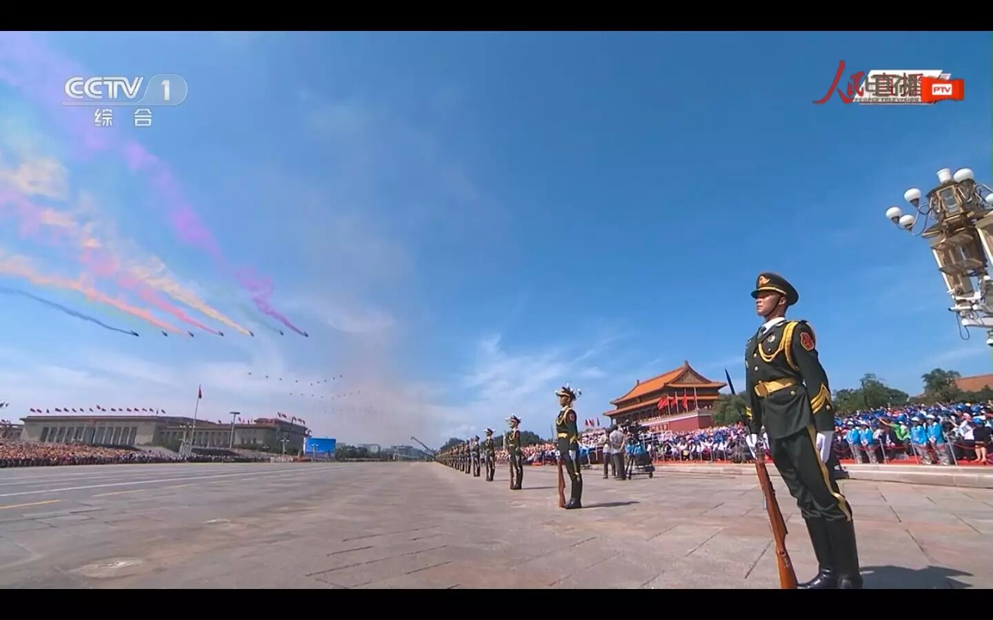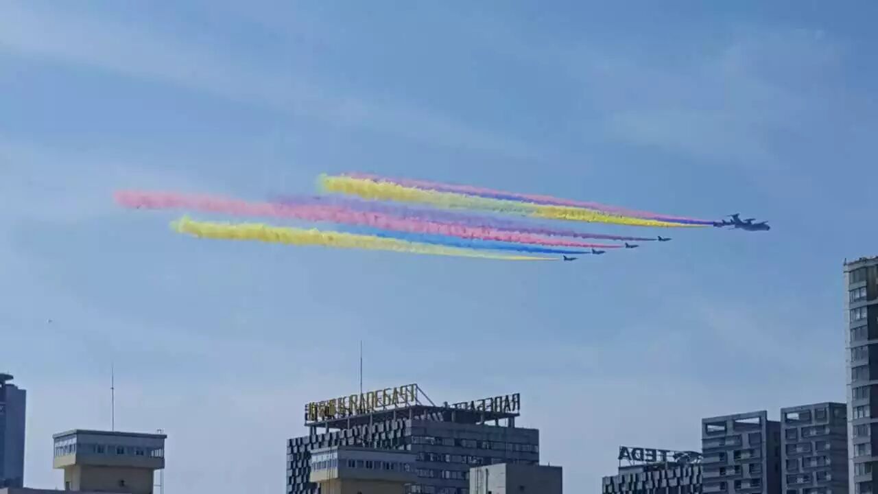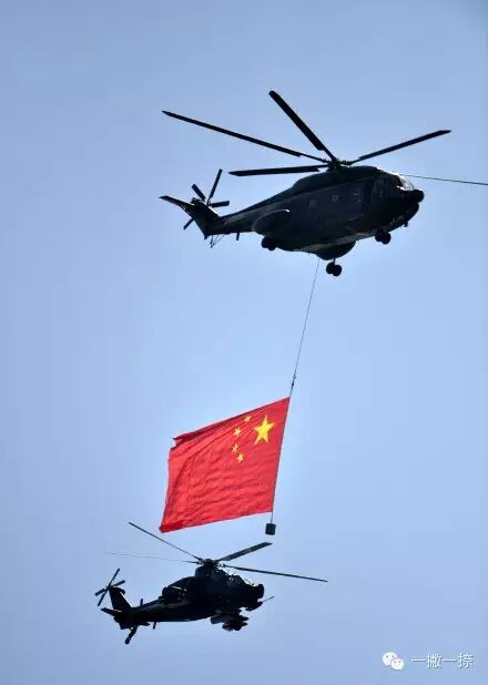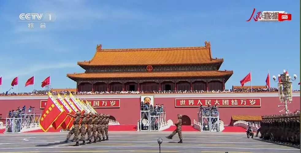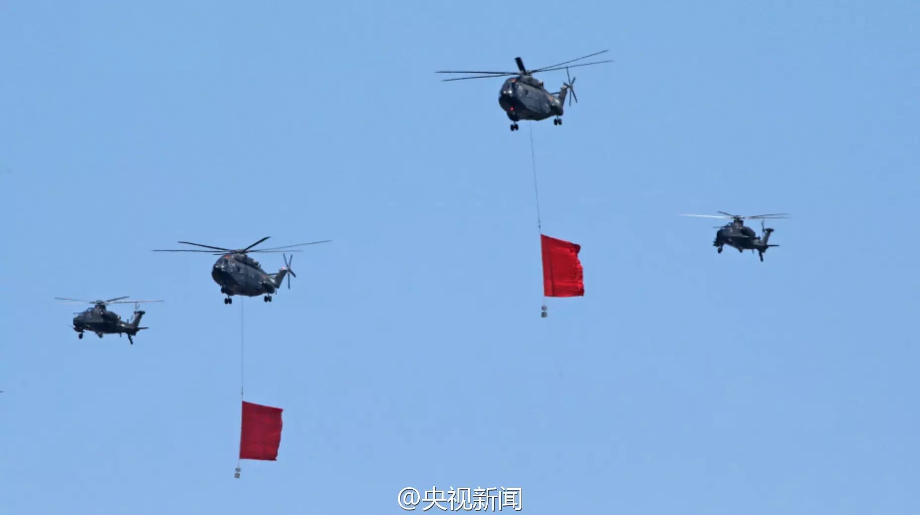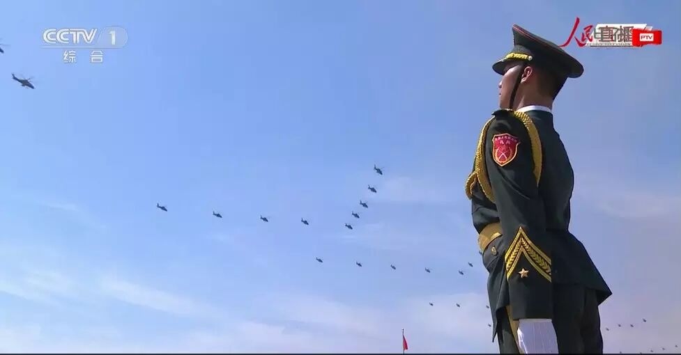 分列式正式开始。空中护旗方队亮相,两组六架直升机分别悬挂中华人民共和国国旗和中国人民解放军军旗飞向天安门广场。