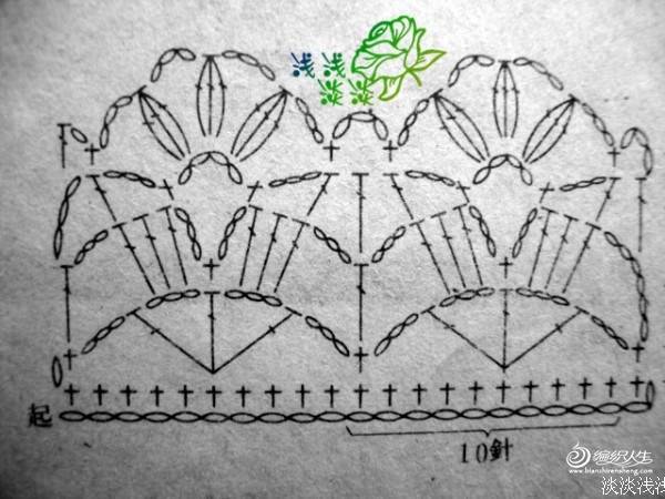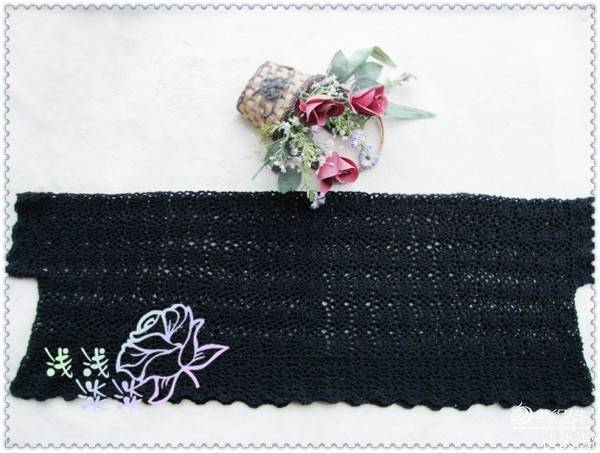 结构:两种花样结合,先中间钩一个长52厘米左右的辫子,然后钩花样40厘米,再在辫子的另一边同样钩40厘米,完成后就是一个80厘米长、52厘米宽的长方形,把宽对折、对折处留13厘米,剩余的缝合,然后在13厘米处钩2排花边当袖口,最后在80厘米长边上钩花边3排,很容易又好看的披肩完成。