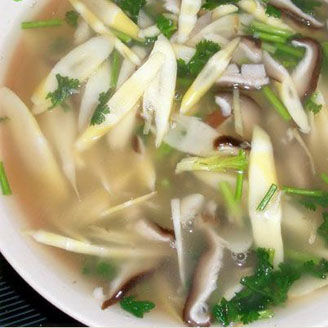 2、将竹笋、姜丝放在汤锅中加适量清水煮15分钟,再放香菇、金针煮5分钟。放精盐,味精即可。