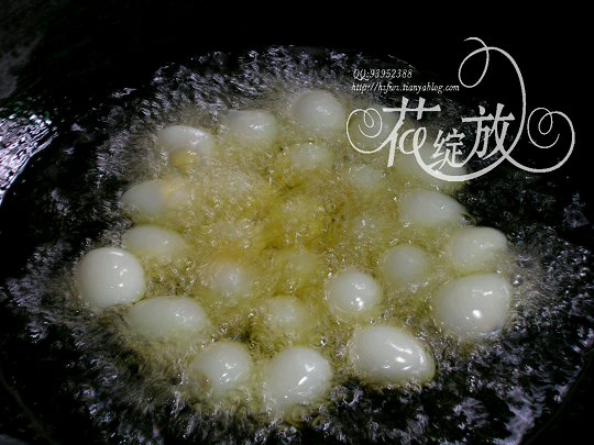 4、锅中放油烧至五成热,下鹌鹑蛋用中小火慢炸。
