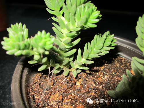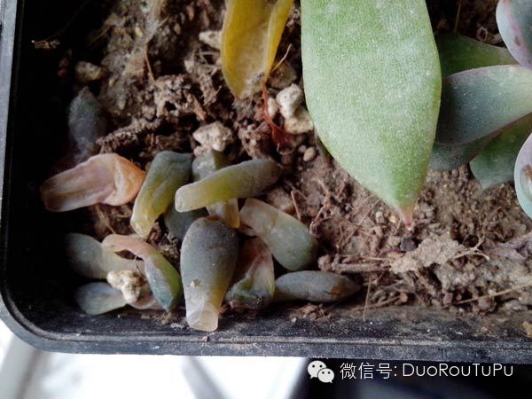 ④叶插:把肉肉的叶片剥下来,朝上放置于湿润土壤上生根发芽。繁殖的一种方法,不适用于所有品种,比如薄叶系列的、子持莲华、珍珠吊兰系列等品种。