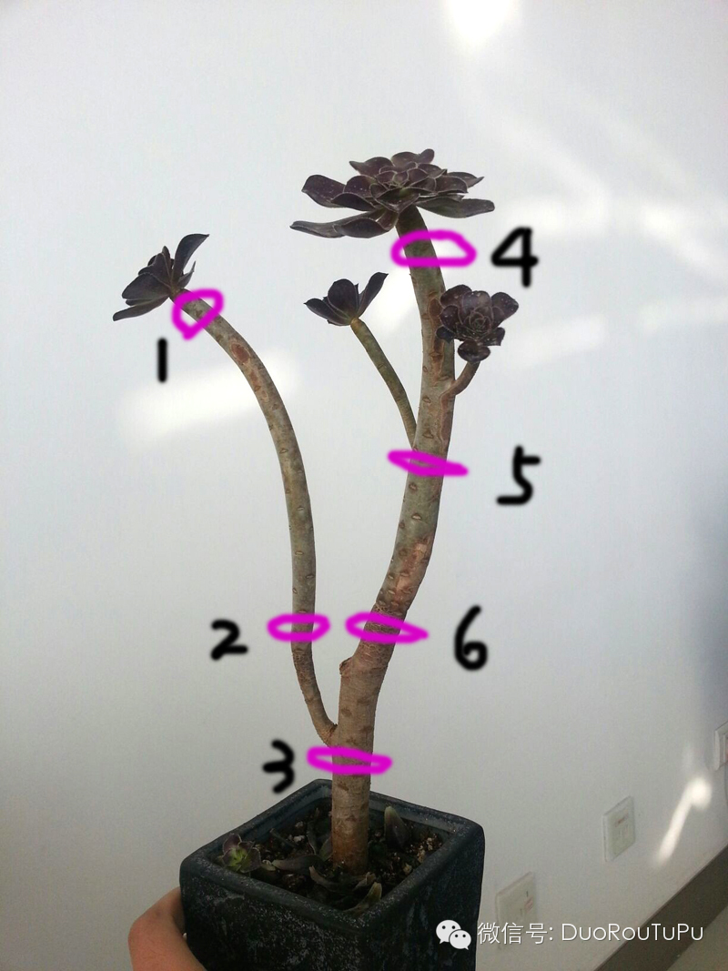 ③砍头:繁殖的一种方式。把肉肉的顶端切除,然后埋入湿润土壤中繁殖。多肉植物繁殖的一种方法,不适用于所有品种。如下图:一般从1或4处切最好,不建议从5以下部分砍,因为下面部分木质化程度太高,发根不易。尤其是3部位,切过之后基本上最下面的就不会再出芽,等于报废。