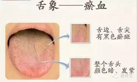 ④瘀斑舌:舌上有青紫色之瘀点或斑点,多为内有瘀血蓄积。