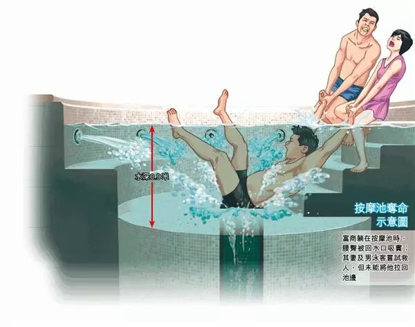 不止是孩子,大人也会发生意外。今年4月,一名在深圳营商的内地人,躺在澳门四季酒店暖水按摩池时,疑水池底部回水口吸力过大,腰背近臀部被紧紧吸实,约20分钟后,职员关掉抽水系统,但商人已溺毙。