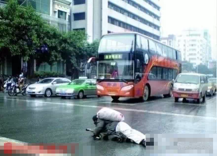 9、 一名下肢瘫痪的残疾人士趴在一辆自制的代步车上,通过斑马线穿越车水马龙的南宁市友爱人民路口。由于残疾男子的行动异常缓慢,刚「走」到路口三分之一处 时,前方红灯、两侧绿灯亮起,此时路口所有的车辆均安静地在原地等候,直到他安全通过路口。恰好被记者拍摄下了折射人性温暖的一幕。