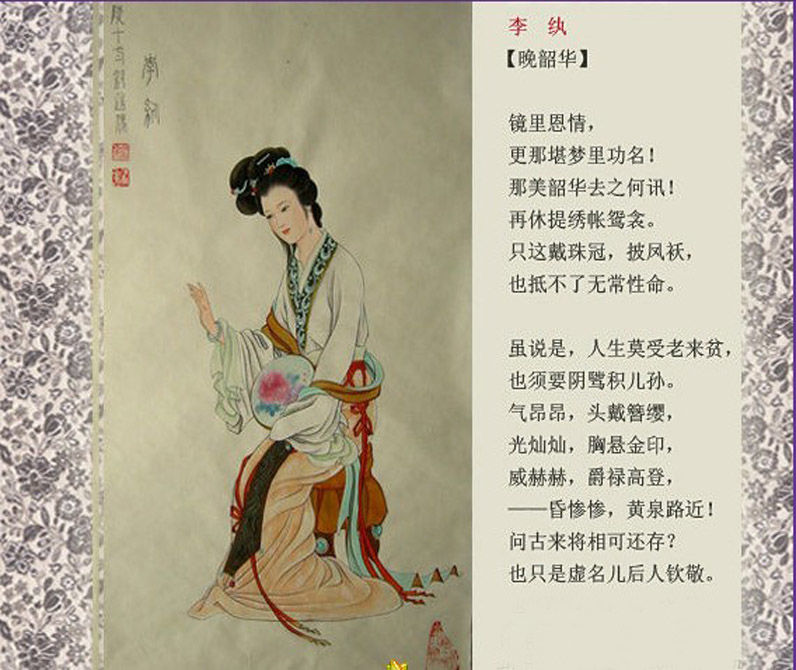 李纨,字宫裁,贾珠之妻,生有儿子贾兰。她出身金陵名宦,父亲李守中曾为国子祭酒。她从小就受父亲“女子无才便是德”的教育,以认得几个字,记得前朝几个贤女便了,每日以纺织女红为要。贾珠不到二十岁就病死了。李纨就一直守寡,虽处于膏粱锦绣之中,竟如“槁木死灰 ”一般,一概不闻不问,只知道抚养亲子,闲时陪侍小姑等女红、诵读而已。她是个恪守封建礼法的贤女节妇的典型。