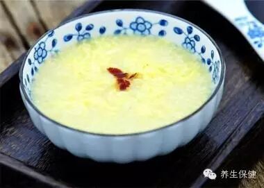 【制作】先以小米煮粥,取汁,再打入鸡蛋,稍煮。