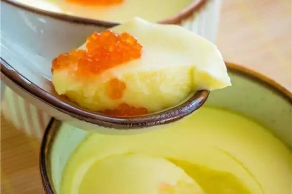 10.一定要用小火蒸10分钟,出锅后,在蛋羹上放上一点鱼子酱。即可食用。(这里用小火可以让蛋羹蒸出细滑Q弹的质地,而且不会出现蜂窝状的气泡哦!)