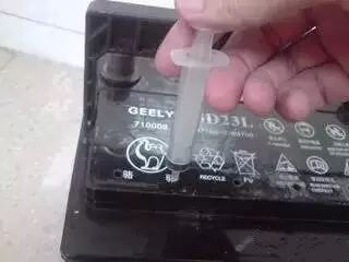 第四,你把刚才买的电池水<实际就是稀释硫酸>用注射器往电瓶里注,加满会止,沒有注射器就在电池水瓶盖开一小口,插根吸管就可以加水了,六个口都要加满,如下图