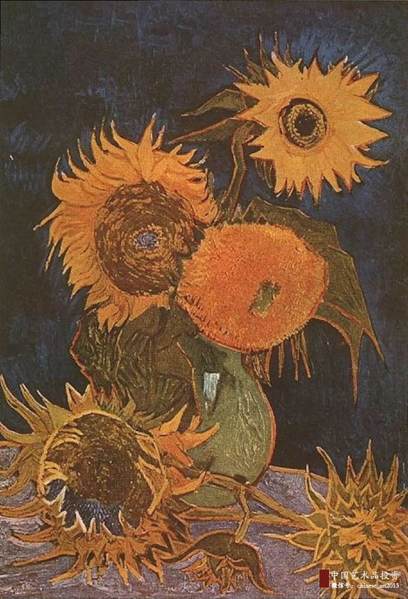 梵高以《向日葵》中的各种花姿来表达自我,有时甚至将自己比拟为向日葵。梵高画中的向日葵色彩金黄,充满了生的欲望,好像在燃烧,感情笔触如此饱满有力,真正是天真充沛生命旺盛的太阳之花。画向日葵即画太阳,也是自画。太阳、向日葵及梵高融成一体。梵高和向日葵谱出相濡以沫生命与共的蓝与黄交响乐章,是其悲剧一生的象征物。
