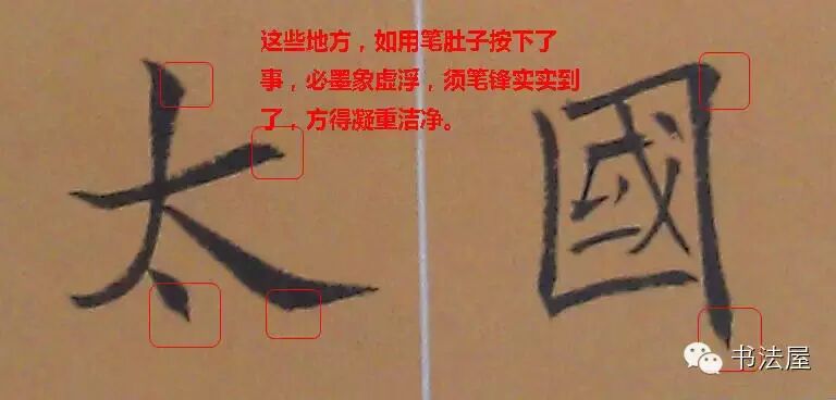 2、“笔锋无处不到”。任何一点一画,从始至终,四面八方,都应是笔锋运走形成的。如写一点顿下后,须顿中有提,使笔锋走至原笔腹按下的位置,使笔力充分作用于纸面,如此方得收笔处坚实凝重的笔触。