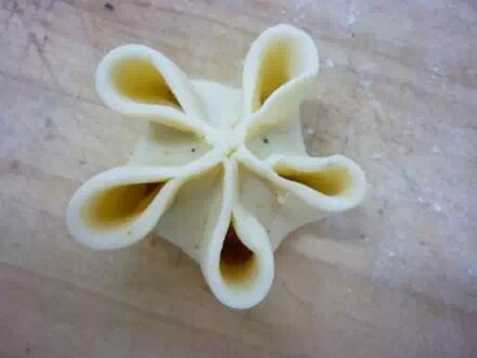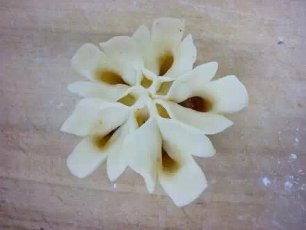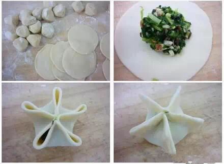 把面团搓条,下剂子擀皮,包入馅心。把圆皮均分5点,粘在一起形成5条边,把口捏紧