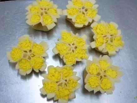 在每片花瓣上剪两刀,就形成了牡丹花的花瓣,把熟蛋黄碾碎,放入花瓣中作点缀