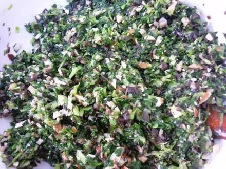 制作方法:青菜洗净入开水锅烫一下,和洗净的木耳、香菇、笋一起切碎,挤去多余水分,加盐、鸡精、糖和麻油调好口味