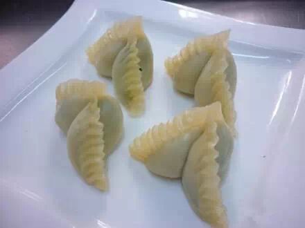 制作方法:面粉加入开水烫成面团,揉光搓条下剂子,擀成圆皮