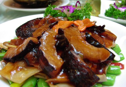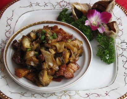 原料:鲜海螺肉250克,木耳25克,净冬笋20克,葱、姜各8克,蒜2克,绍酒16克,酱油8克,白糖25克,精盐3克,生油80克,芝麻油20克。