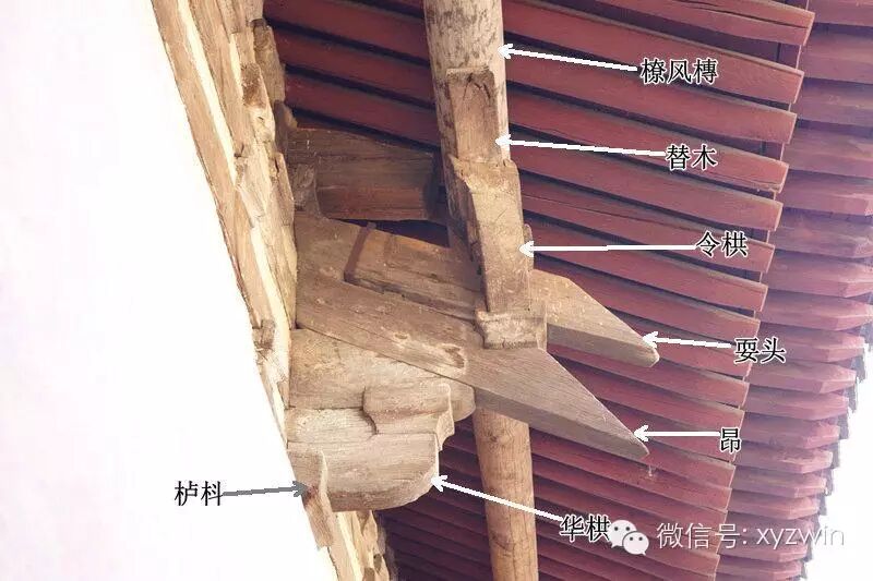 再做张假昂与耍头区分的图。假昂和真昂一样也出跳,区别是真昂是斜置构件,用杠杆原理挑出,而假昂是水平构件,只把昂尖做成昂形,作用与华栱相当。假昂与耍头的区分同样是看是否出跳,此图下面出跳托令栱的是昂(假昂),上面不出跳的是耍头。(山西平顺北社观音堂)