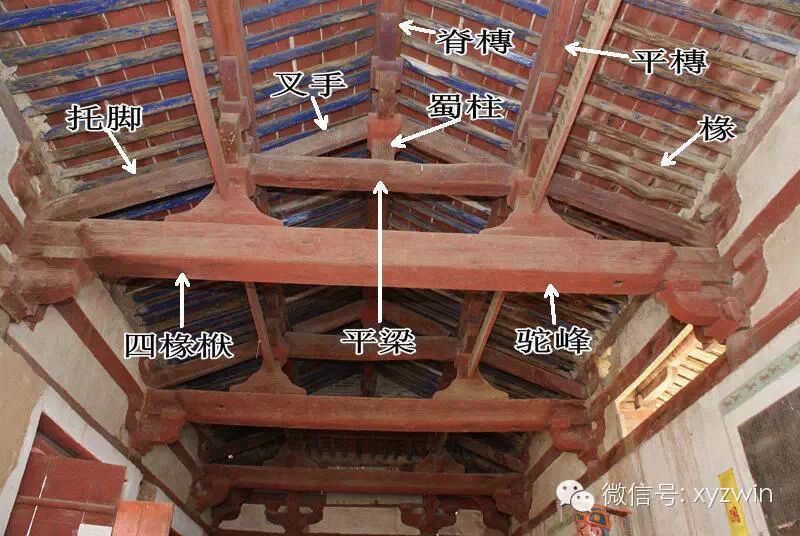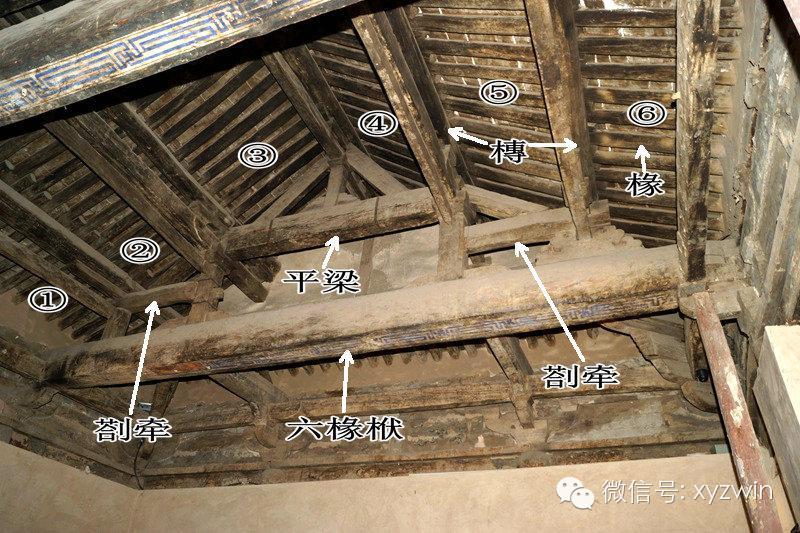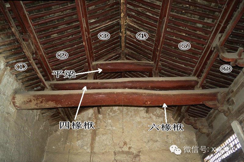 古建筑的梁架结构有多种组合,这也是一座六椽檐栿通搭的建筑,结构与上图有很大不同,六椽栿上用四椽栿,四椽栿上用平梁(两椽),逐层递减,形成中国式房屋的山尖(山西泽州西四义普觉寺)