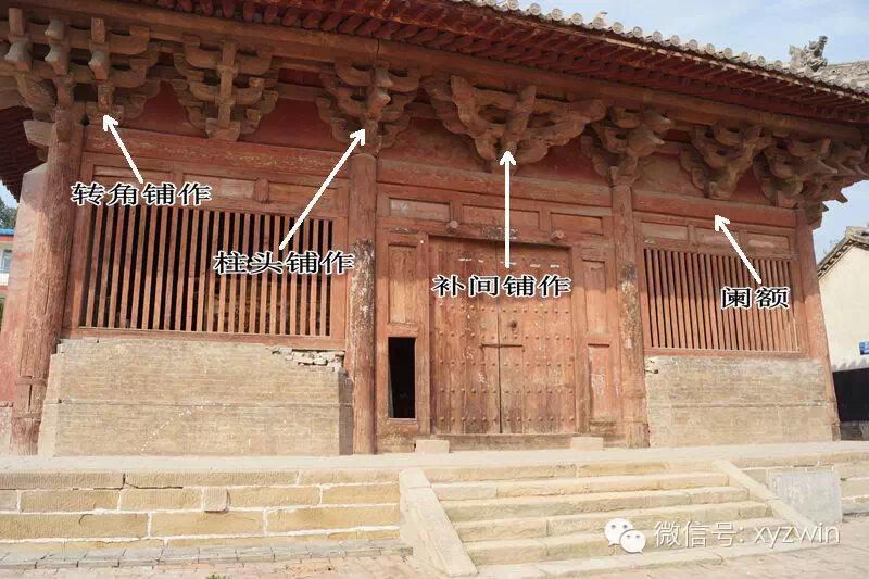 阑额是柱头间的联系构件,安装于柱头,上皮与柱齐平,有些建筑柱子最下端也有一道这样的联系构件,称为“地栿”。普拍方安装于柱头阑额之上,压于栌枓之下。普拍方与阑额的断面呈“T”字形。早期建筑一般不用普拍方,现存十几座唐和五代建筑中只有平顺大云院弥陀殿使用了普拍方,宋以后开始应用广泛。(山西沁县大云院正殿)