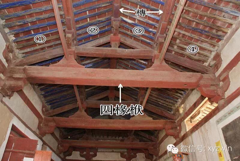 解释下四椽栿,栿(fú)就是梁,建筑的纵向主要承重构件,栿上面横向的构件是槫(tuán),现在称为檩条,槫上面纵向搭的小木棍是椽(chuán),两条槫之间的椽子称为一架椽,照片中这条栿托了四架椽子,称为四椽栿。同理托六架椽子的就是六椽栿。(山西芮城广仁王庙正殿)
