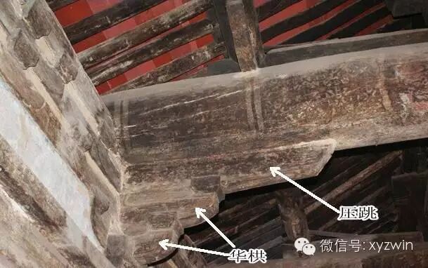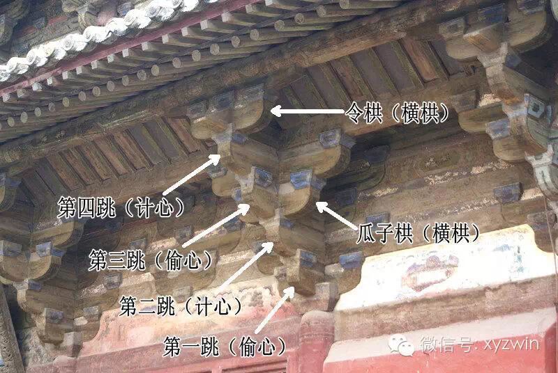 铺作里转一般比较简单,配图这个使用了华栱和压跳,也有些直接只用华栱。(山西屯留宝峰寺五方佛殿)