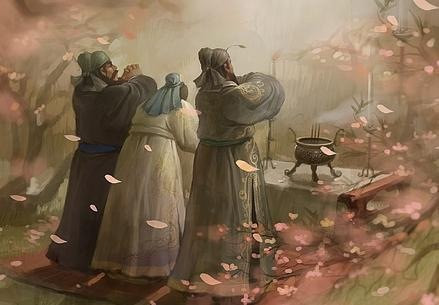天明,再唤乡老,问:“此处有坟相近否?”乡老曰:“松阴中有荆轲墓,墓前有庙。”角哀曰:“此人昔刺秦王,不中被杀,缘何有坟于此?”乡老曰:“高渐离乃此间人,知荆轲被害,弃尸野外,乃盗其尸,葬于此地。每每显灵。士人建庙于此,四时享祭,以求福利。”角哀闻言,透信梦中之事。引从者径奔荆轲庙,指其神而骂曰:“汝乃燕邦一匹夫,受燕太子毒养,名姬重宝,尽汝受用。不思良策以副重托,人秦行事,丧身误国。却来此处惊惑乡民,而求祭把!吾兄左伯桃,当代名懦,仁义廉洁之士,汝安敢逼之?再如此,吾当毁其庙,而发其冢,永绝汝之根本!”骂讫,却来伯桃墓前祝曰:“如荆轲今夜再来,兄当报我。”归到享堂,是夜秉烛以持。果见伯桃哽咽而来,告曰:“感贤弟如此,亲荆轲从人极多,旨土人所献。贤弟可柬草为人,以彩为衣,手执器械,焚于墓前。吾得其助,使荆轲不能侵害。”言罢不见。角哀连夜使人束草为人,以彩为衣,各执刀枪器械,建数十于墓侧,以火焚之。祝曰:“如其无事,亦望回报。”