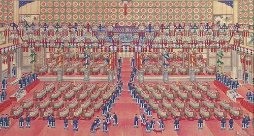 从《大婚典礼全图册》第二册《纳采礼筵宴图》中可以看到,桂祥家张灯结彩的喜棚里,摆满了宴桌,朝中官员全部依次而坐,享用纳采宴。酒过三巡,以桂祥为首的众官员面向皇宫的方向跪拜,以表示对皇帝所赐酒席的感谢。