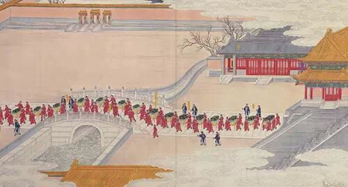 《皇后妆奁图》一(妆奁,即嫁妆),皇后妆奁共二百抬,于大婚前期分两日恭进,即正月二十四日和二十五日。