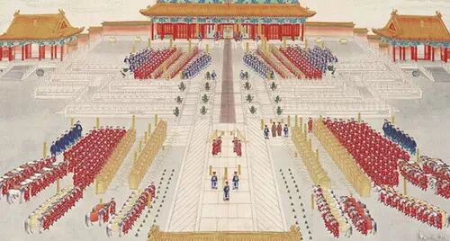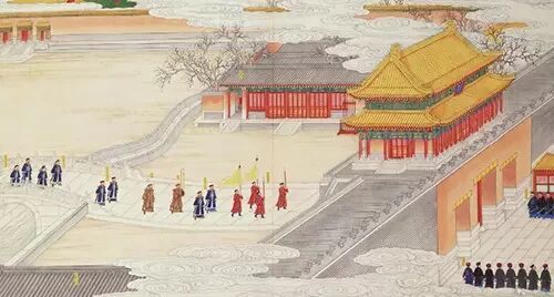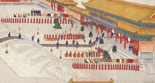 《纳采礼筵宴图》四,正使受节,御仗在前引导,出太和门。