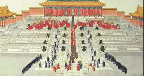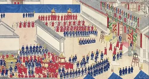 《册立奉迎图》二,光绪十五年正月二十七日,举行大婚典礼。皇上行三跪九拜礼。