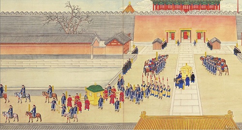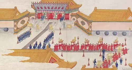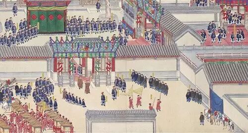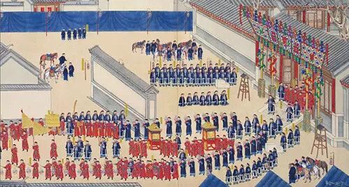 《皇后出宫至邸第图》六,档案记载:皇后出宫至邸第,届时,后父率子弟在大门外跪迎。所有守卫官员人等敬谨轮流备差。